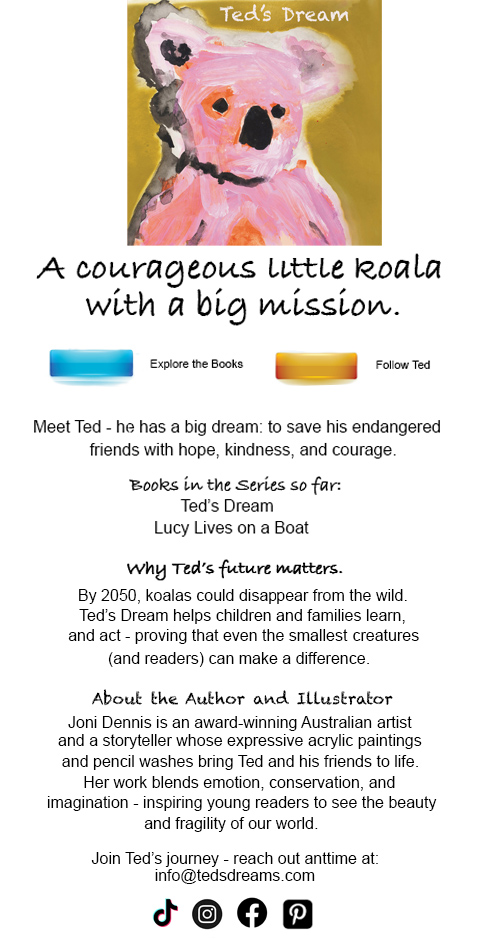 Meet Ted, a courageous little koala with a big dream — to save his endangered friends and their forest home. Ted’s stories weave fact and fantasy, inviting children into a world of kindness, courage, and community. The series shines a light on real Australian wildlife and the small actions we can take to help them thrive.